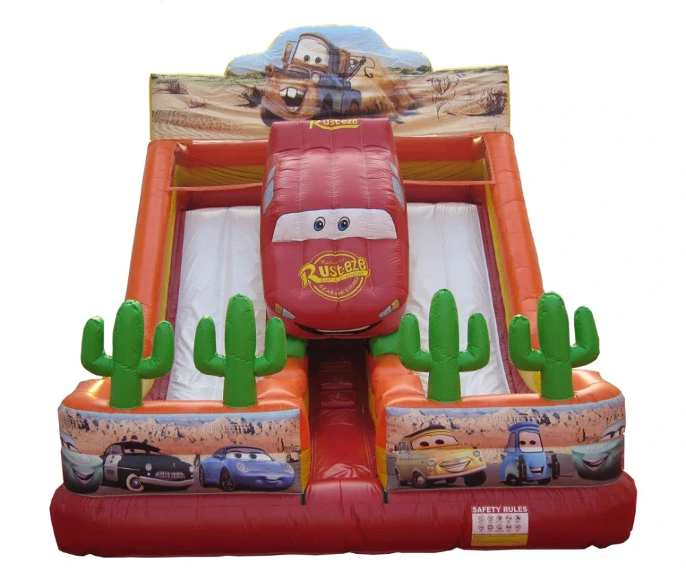 Dank der zwei Rutschbahnen können mehrere Kinder gleichzeitig rutschen – perfekt für Geburtstage, Sommerfeste, Schul- oder Vereinsveranstaltungen. Die aufblasbaren Kakteen und das große 3D-Auto machen das Erlebnis besonders realistisch und sorgen für echtes Abenteuer-Feeling.